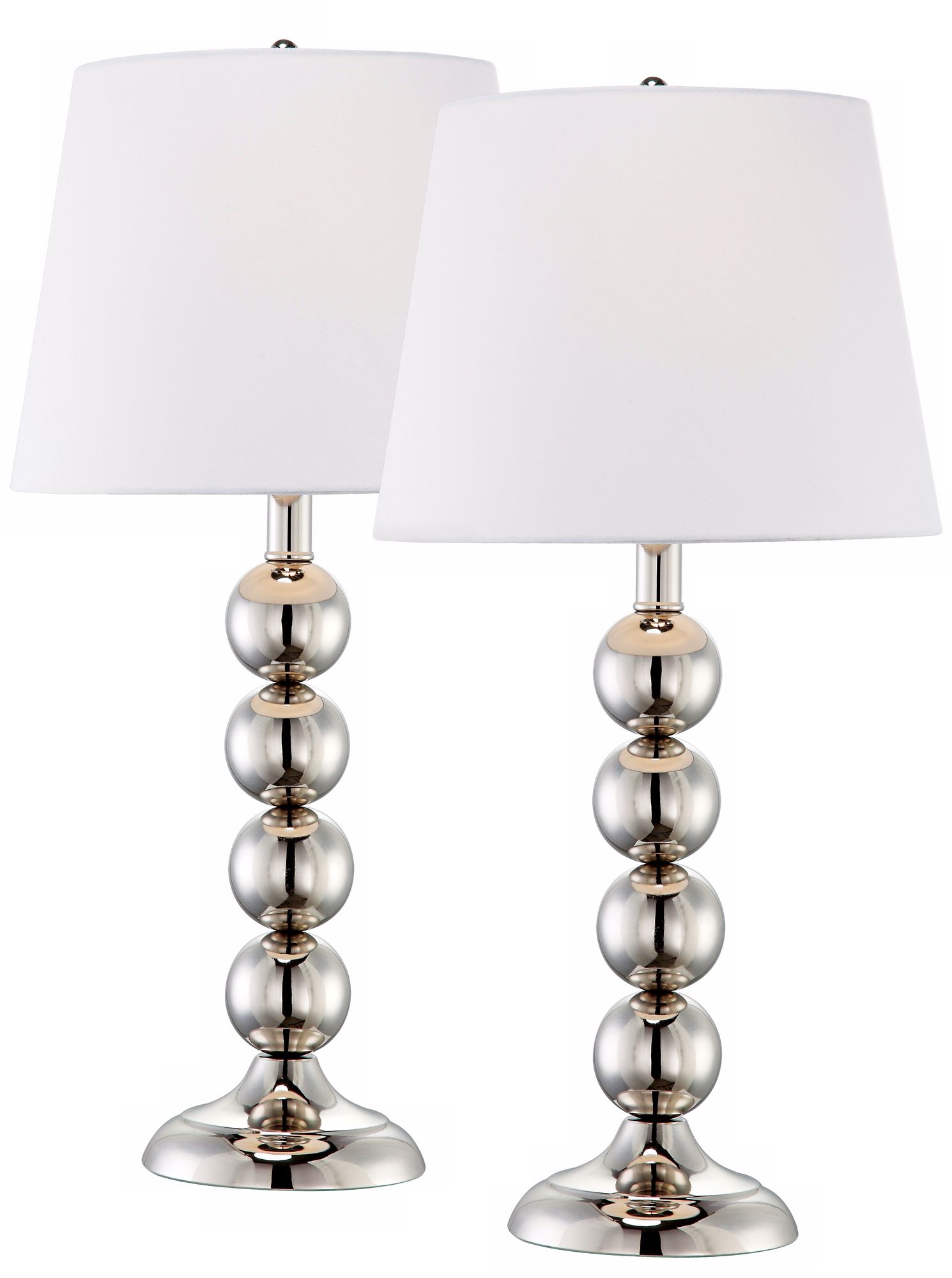 during a browse for affordable, chic lighting i came across these stylish little beauties at lamps plus! the image makes them look sort of mercury-glass-ish, but they are actually chrome and at $69.95 for a set of two, you could even switch out the lamp shades. i'd probably swap them for something more like this or maybe even something with a bit of classy trim like these (loving the nod to french linens).